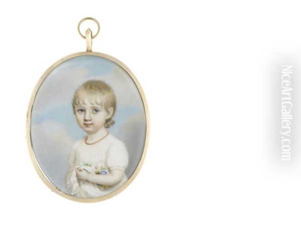 A Young Girl, Wearing White Dress And Coral Necklace, A Posy Of Flowers Gathered In Her Pinafore, Her Blonde Hair Cropped Short