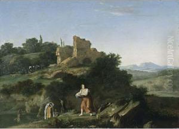 Nymphs Bathing And A Washerwoman Near Ruins In A Southern Landscape