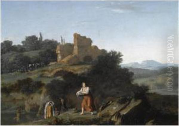 Nymphs Bathing And A Washingwoman Near Ruins In A Southern Landscape