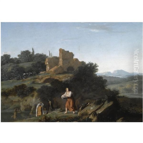 Nymphs Bathing And A Washingwoman Near Ruins In A Southern Landscape