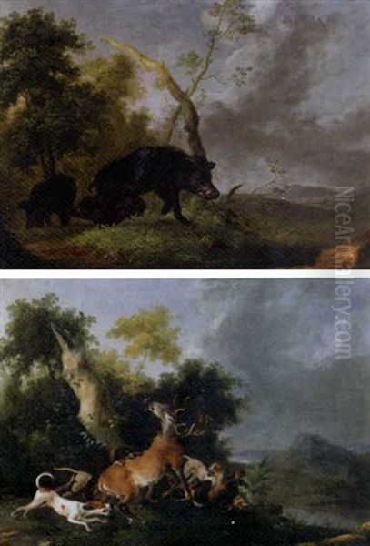 A Landscape With Boars Foraging (+ A Landscape With Hounds Bringing Down A Deer; Pair)