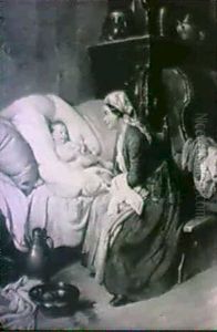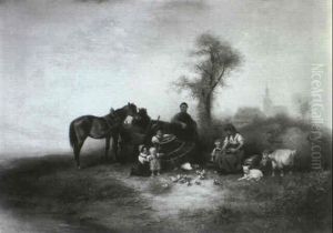 Bauernfamilie bei der Kornernte beobachtet einen Zug der Kavallerie.