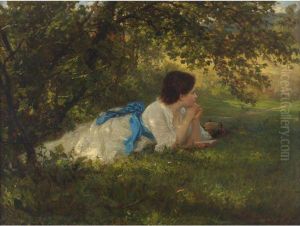 Girl In A Blue Sash Oil Painting by Wilhelm Amberg