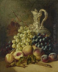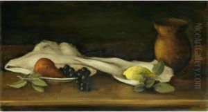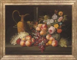 Blumenstilleben Mit Obstschale, Becher, Tasse Und Krug Auf Einemtisch