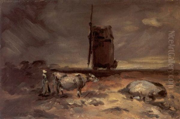 Gewitterlandschaft Mit Windmuhle Und Kuhhirtin
