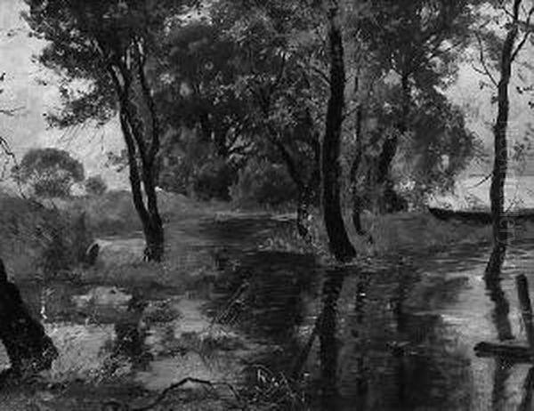 "baumbestandene Uferlandschaft". Rucks. Auf Alten Besch. Klebezetteln Bez. Und Betitelt Sowie Nachlass-stempel Und -bestatigung. Ol Auf Lwd. 40 X 52,5 Cm. Rahmen