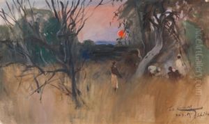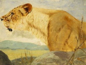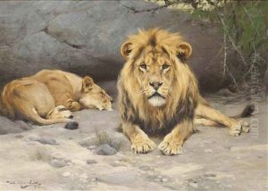 Lowenpaar, Das Ein Feuer In Der Dunstigen Steppe Beobachtet