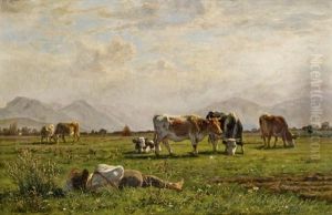 Weidelandschaft Mit Kuhen An Der Tranke Und Kirchdorf Im Hintergrund