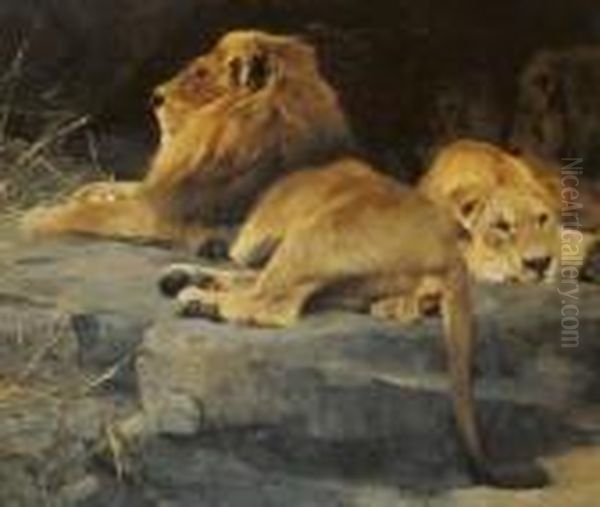 Ein Lowe Und Eine Lowin Vor Der Hohle. Signiert Unten Links: Wilh. Kuhnert. Verso Vom