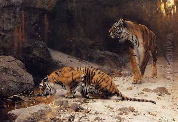 Bring the timeless beauty of Wilhelm Kuhnert's Tigers at a Drinking Pool into your home with a handmade oil painting reproduction. Carefully recreated on canvas by skilled artists using traditional techniques, this piece captures the delicate brushwork, subtle light, and vibrant color of the original masterpiece. With museum-level quality and rich texture, it brings elegance and artistic depth to any space. Enjoy free shipping and make this masterpiece a part of your personal collection.
