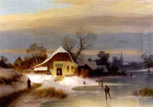 Winterliche Dorflandschaft Mit Eislaufern Am Zugefrorenen Fluss