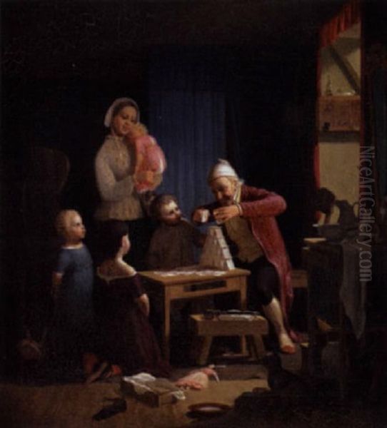 Far Bygger Korthus, Mens Mor Og Bornen Ser Beundrende Til