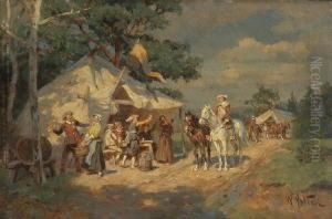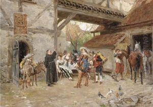 Landsknechte Und Trommler Beim Einstellen Der Pferde In Einerschenke Mit Jungen Madchen Und Einem Monch