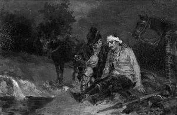 "sancho Panza Versorgt Den Verwundeten Don Quijote". Sign. Ol Auf Karton. 30,5 X 46,5 Cm. Rahmen