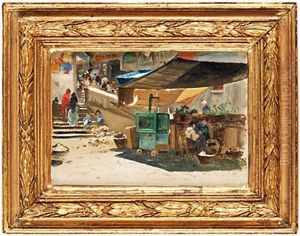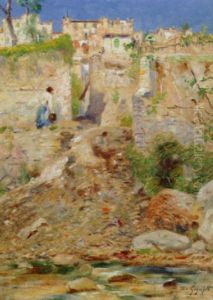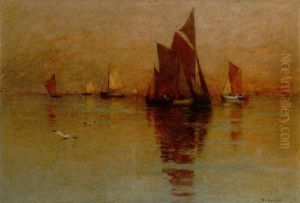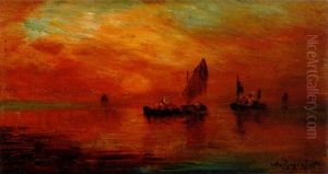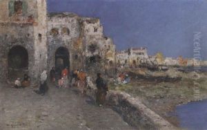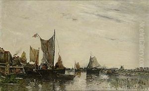 Landskap Med Byggnader Vid Vatten - I Afton Sol