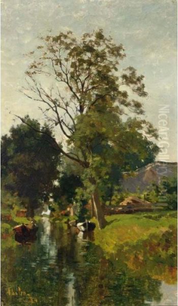 Summer Landscape With Moored Boats In A Waterway