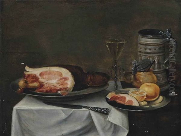 A Ham With Bone On A Pewter Platter, Lemons And Ham On A Pewter Platter, A Knife, A Pitcher, A Mustard Pot And A Facon-de-venise Wine Glass...