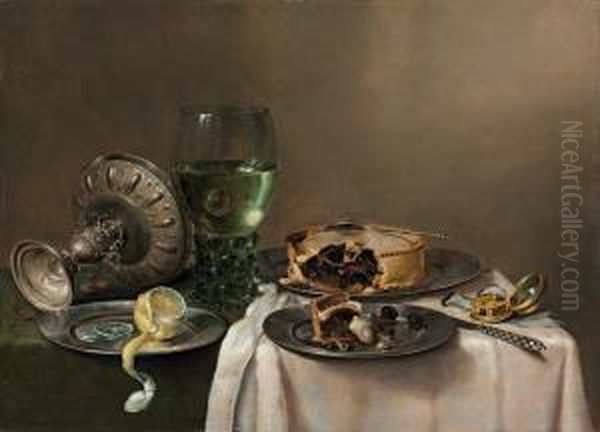 A 'pronk' Still-life, With A Roemer, An Upturned Silver Tazza, Ahalf-peeled Lemon On A Pewter Plate, With A Pie, A Timepiece And Aknife