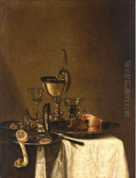 Still Life Of A Nautilus Cup, An Overturned Tazza, A Partially Eaten Pie In A Pewter Bowl And A Knife, Together With Two Wine Glasses, And Olives And A Peeled Lemon In Pewter Dishes, All Arranged Upon A Table Top Partly Draped With A White Cloth