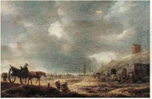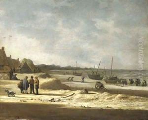 Fishermen And Women Conversing On The Beach, Other Fishermenunloading Their Catch In The Background
