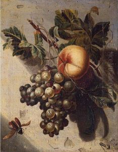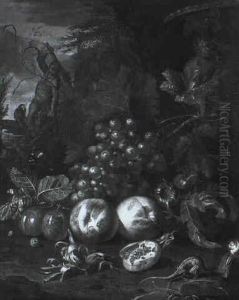 A Peach, A Plum And A Pear, With Grapes On A Stone Ledge, An Italianate Landscape Beyond