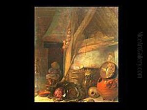 A Barn Interior With Pumpkins And Other Vegetables, Pewter Plates And A Copper Bowl Next To A Barrel, Two Peasants In The Background