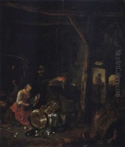 Domestic Interior With A Figure Sweeping, A Maid Spinning By A Fire Beyond
