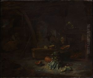 A Kitchen Interior With A Maid And A Woman Seated By A Fire