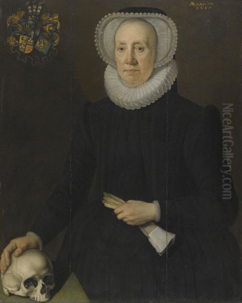 Portrait Of An Elderly Lady Of The Van Heemstra Family Of Friesland, Holding A Pair Of Gloves And With Her Right Hand Resting On A Skull