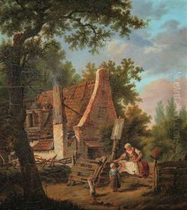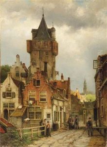 Dutch Figures Conversing In The Streets Of A Dutch Town On A Sunnyday, A Hay-cart Passing By