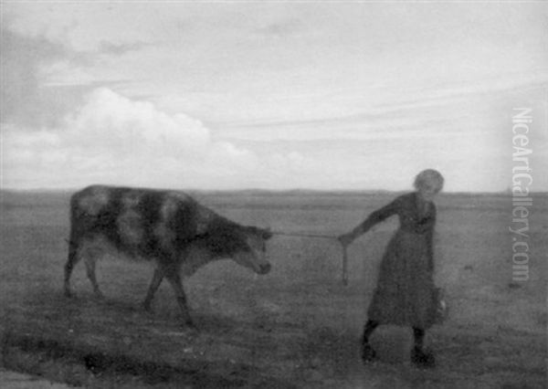 Eine Bauerin Fuhrt Ihre Kuh Uber Eine Wiese Oil Painting by Willem Pothast