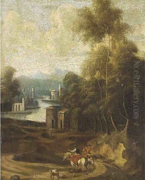 A wooded river landscape with mounted travellers on a path, a town beyond