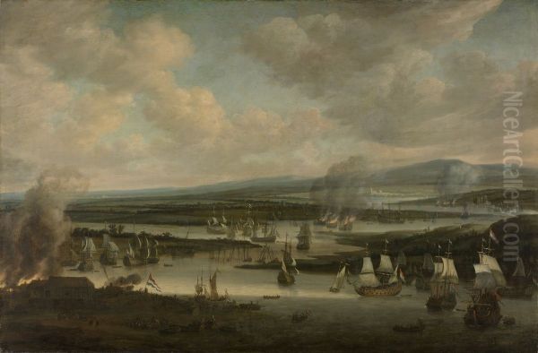 Het verbranden van de Engelse vloot bij Chatham, juni 1667, tijdens de Tweede Engelse Zeeoorlog (1665-1667)