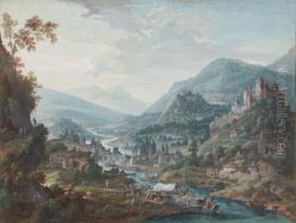 A Rhine Landscape With A Town On The River And Merchants Loadingcargo On Boats