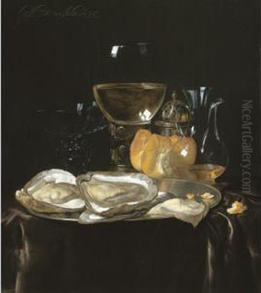 Still Life With A Roemer, A Carafe Of Vinegar, A Glass Tazza, A Bread Roll And Oysters On A Silver Plate On A Draped Table Top