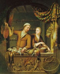 A Boy Buying Chestnusts From An Old Woman At A Shop Window, With Fish, Apples, And Other Vegetables On Plates And In Baskets