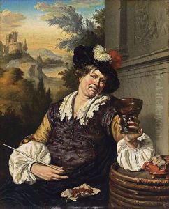 Ein Weintrinker Sitzt Mit Erhobenem Romer An Einem Fass, Auf Das Er Seinen Federhut Gelegt Hat, Und Blickt Auf Den Betra