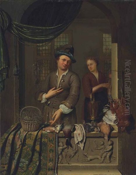 A Poultry Seller And His Wife At A Casement, With Eggs In A Wicker Basket, A Mallard Duck And Other Birds On A Partially Draped Stone Ledge Sculpted With Playing Putti