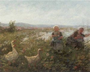 A Landscape With Two Girls Playing In A Meadow Near A House