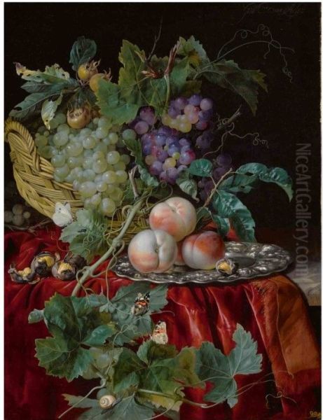 Still life with grapes in a basket, peaches on a silver dish, medlars, two butterflies, a fly and a snail, all on a red velvet cloth over a partially draped ledge
