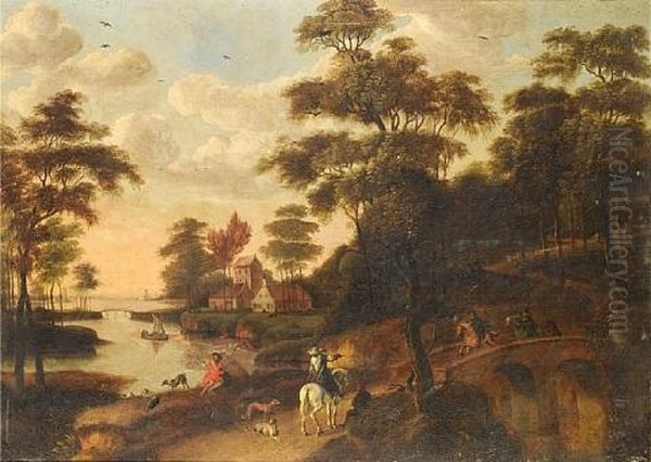 Horsemen Crossing A Bridge Before A Coastal Landscape