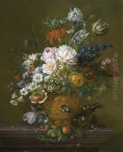 Still Life Of Mixed Flowers In A Vase And A Bird's Nest On A Marble Ledge