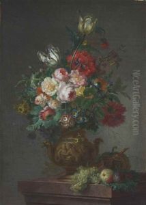 A Still Life With Tulips, Peonies, Primroses, Morning Glories And Other Flowers On A Ledge With Fruit