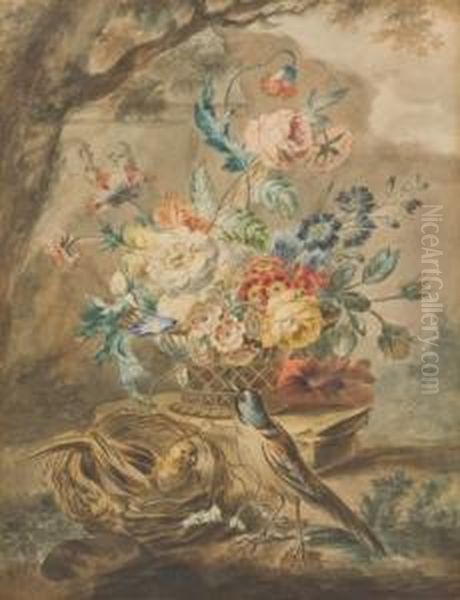 Stilleben Mit Vogelnest Und Blumenbouquet In Bastkorb
