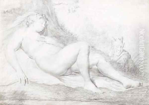A sleeping nymph watched by a satyr
