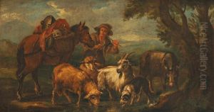 A Shepherd And His Herd Near A River With A Stone Bridge