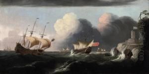 A man-o'-war firing at a sinking ship, smallschips exchanging fire from close range