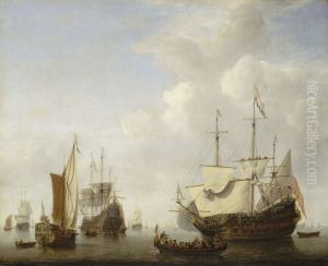 Dutch Ships At Anchor Off The Coast, With Other Small Boats Around