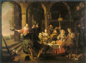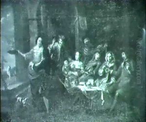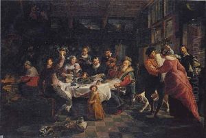 An Interior With Various Figures Seated At A Table Dining, Drinking And Making Music
