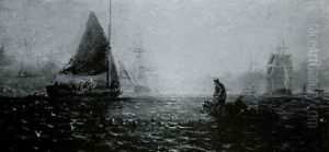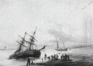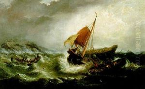 A British Frigate At Anchor With Rescue Boats Off Towards Ship In Distress